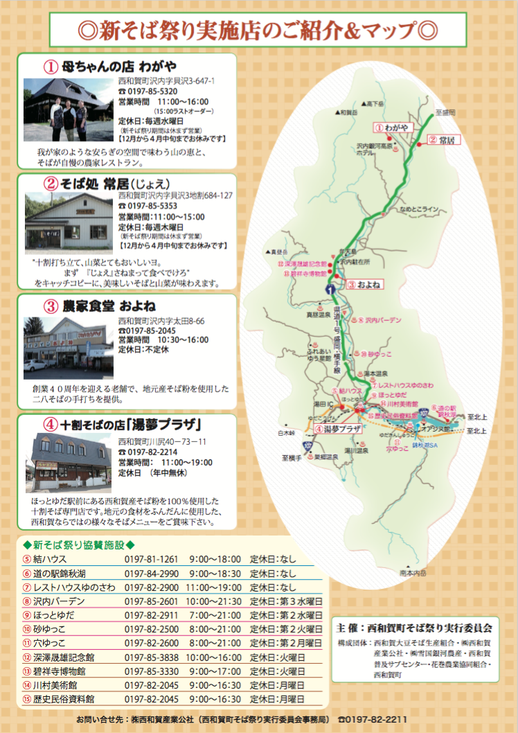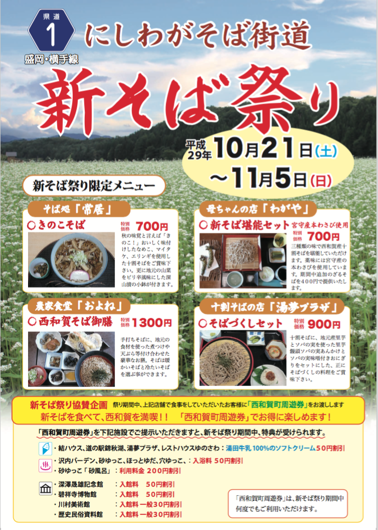 Home › 過去のお知らせ › 【イベント】西和賀新そば祭り2017のご案内(10/21~11/5) 2017-10-05 【イベント】西和賀新そば祭り2017のご案内(10/21~11/5) タグ: 新そば祭り, 西和賀 関連記事 白金豚のローストポーク丼の提供開始について(1/2~) 山岳工房Korvaのパン販売開始のお知らせ 月刊acute2017年4月号に掲載されました キッチンカー出店情報(10/21〜22) 湯田ダムカレー冬バージョン提供開始について(11/23~) 【新商品情報】西わらびピクルス新発売について 【イベント】西和賀新そば祭り2017のご案内(10/21~11/5) コメントを残す コメントをキャンセルメールアドレスが公開されることはありません。 ※ が付いている欄は必須項目ですコメント ※ 名前 ※ メール ※ サイト 次回のコメントで使用するためブラウザーに自分の名前、メールアドレス、サイトを保存する。 上に表示された文字を入力してください。 Δ