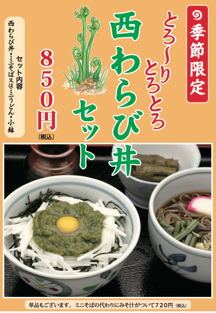 Home › 過去のお知らせ › 西わらび丼の提供について(5/21〜) 2017-05-21 西わらび丼の提供について(5/21〜) 道の駅錦秋湖にて、5/21(日)より季節限定メニューの西わらび丼セットを850円(税込)にて提供させて頂きます。 ※ミニそばの代わりにみそ汁が付いた単品720円(税込)への変更が可能です。 タグ: レストハウスゆのさわ, 西わらび, 西わらび丼, 道の駅錦秋湖 関連記事 【イベント】西和賀新そば祭り2017のご案内(10/21~11/5) 夏のレストランメニューのご案内 西和賀まるごとラーメンの提供開始について(12/1~) 湯田ダムカレー秋バージョン提供開始について(9/4~) 湯田ダムカレー秋バージョンの提供終了について(11/30) にしわが山菜稲庭うどんセットの提供開始について(5/15~) 【イベント情報】山菜フェスタ2017のご案内(6/4) コメントを残す コメントをキャンセルメールアドレスが公開されることはありません。 ※ が付いている欄は必須項目ですコメント ※ 名前 ※ メール ※ サイト 次回のコメントで使用するためブラウザーに自分の名前、メールアドレス、サイトを保存する。 上に表示された文字を入力してください。 Δ