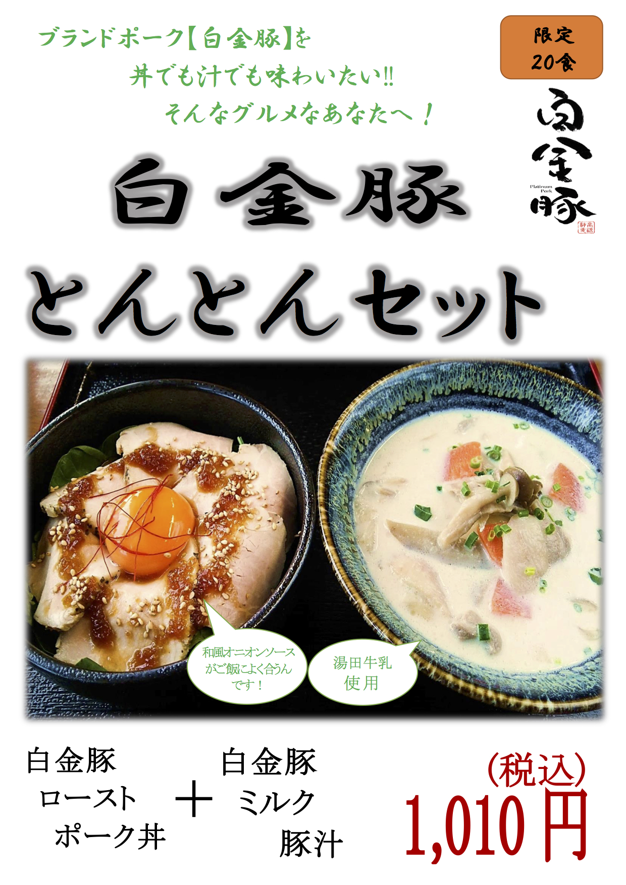 Home › 過去のお知らせ › 白金豚のとんとんセットの提供開始について(1/1~) 2018-01-01 白金豚のとんとんセットの提供開始について(1/1~) 「道の駅錦秋湖」のレストランにて、白金豚のローストポーク丼とミルク豚汁のセットメニュー「白金豚とんとんセット」を、1,010円(税込)で1/1(月)より1日限定20食で、提供させて頂きます。 タグ: とんとんセット, ミルク豚汁, ローストポーク丼, 白金豚, 道の駅錦秋湖 関連記事 年末年始の営業日および営業時間について にしわが春ラーメンの提供開始について(4/1〜) 秋限定メニューの提供開始について(10/1~) 【イベント情報】山菜フェスタ2017のご案内(6/4) 春の山菜「ヒロッコ」の入荷開始について 道の駅きっぷのご紹介 春の新メニューのご紹介(3/24〜) コメントを残す コメントをキャンセルメールアドレスが公開されることはありません。 ※ が付いている欄は必須項目ですコメント ※ 名前 ※ メール ※ サイト 次回のコメントで使用するためブラウザーに自分の名前、メールアドレス、サイトを保存する。 上に表示された文字を入力してください。 Δ
