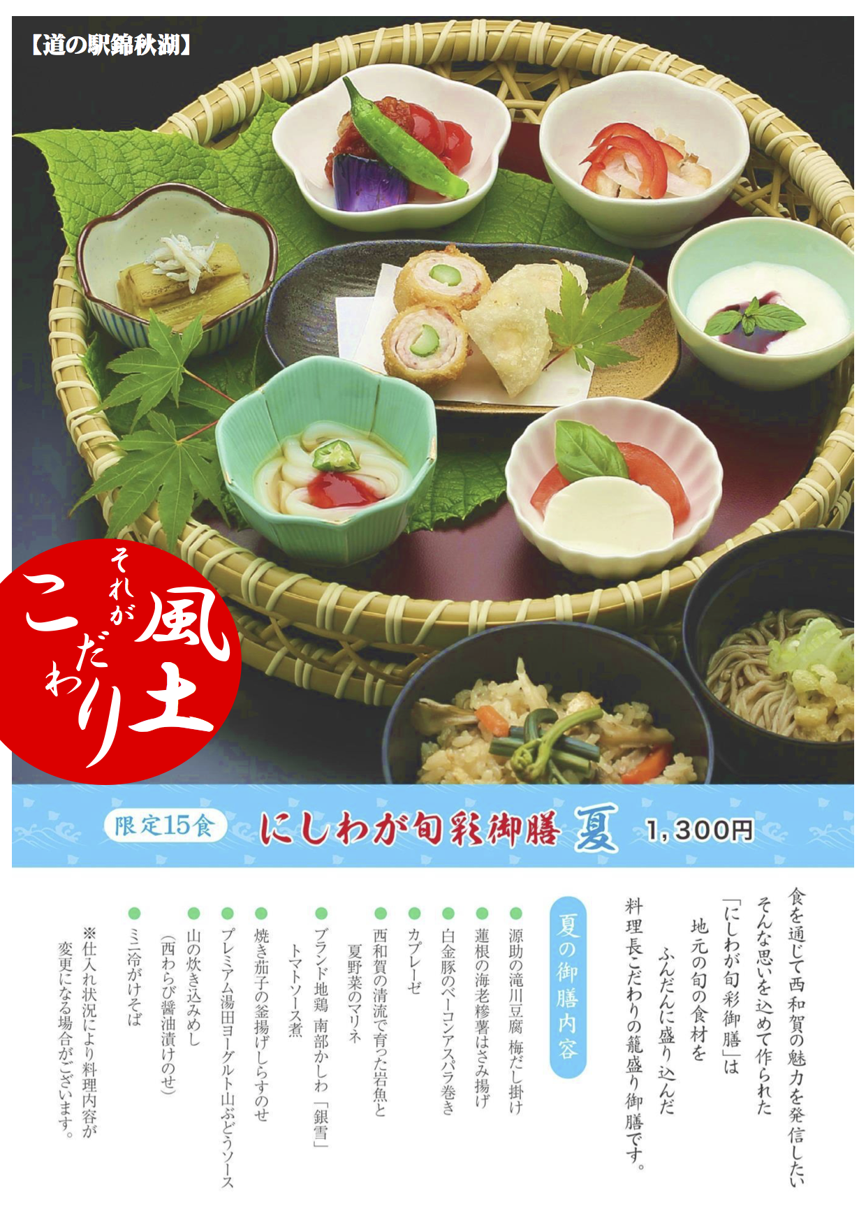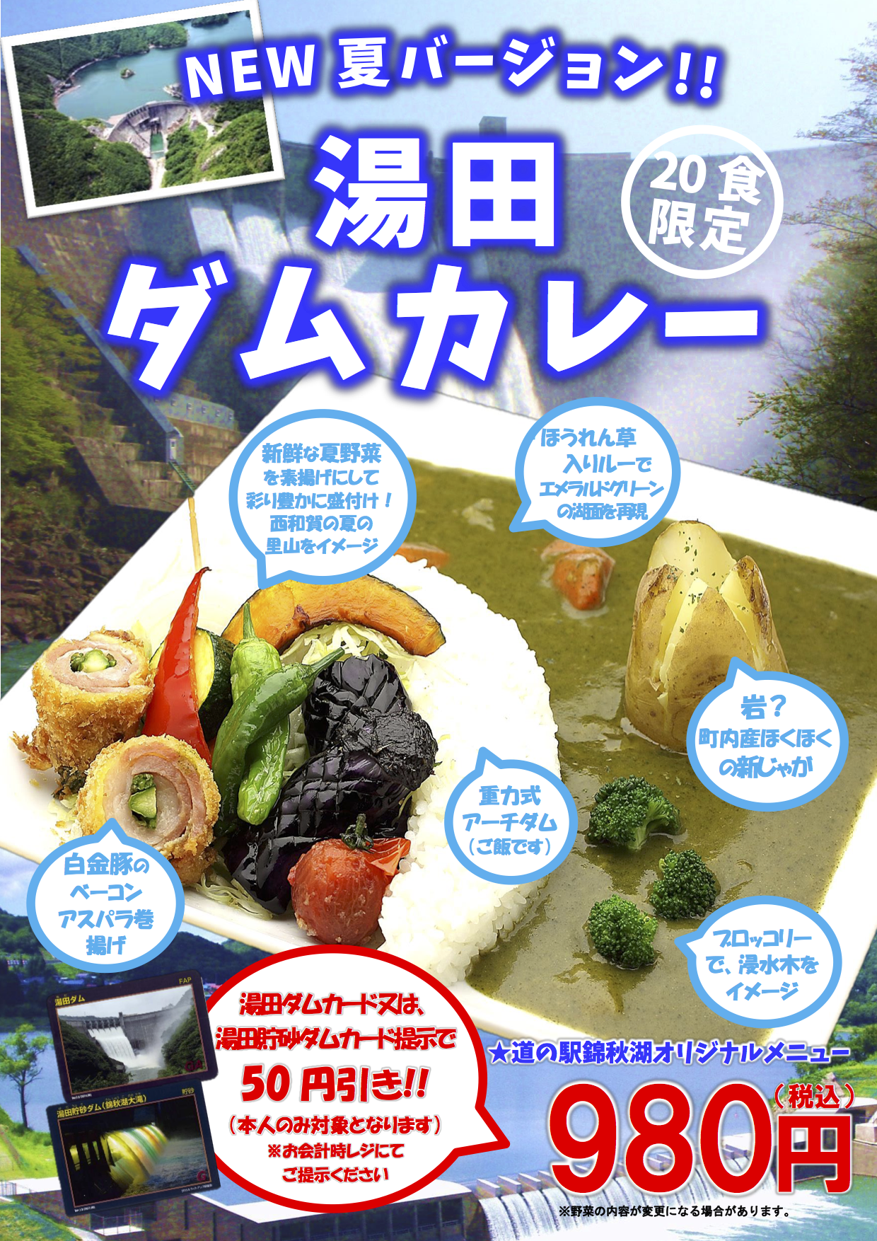 Home › 過去のお知らせ › 夏の限定メニューの提供について 2018-06-30 夏の限定メニューの提供について 『道の駅錦秋湖』にて、7/1(日)より夏の限定メニューを4品ご提供させて頂きます。 タグ: 夏の限定メニュー, 道の駅錦秋湖 関連記事 湯田ダムカレーの提供開始について(4/15~) 公衆無線LANサービスの提供を開始について 秋限定メニューの提供開始について(10/1~) 道の駅きっぷのご紹介 銀河高原ビール「そよ風のケルシュ」の販売開始について 【お知らせ】6/2(土)の「満天☆青空レストラン」で西わらびが紹介されます 夏のレストランメニューのご案内 コメントを残す コメントをキャンセルメールアドレスが公開されることはありません。 ※ が付いている欄は必須項目ですコメント ※ 名前 ※ メール ※ サイト 次回のコメントで使用するためブラウザーに自分の名前、メールアドレス、サイトを保存する。 上に表示された文字を入力してください。 Δ