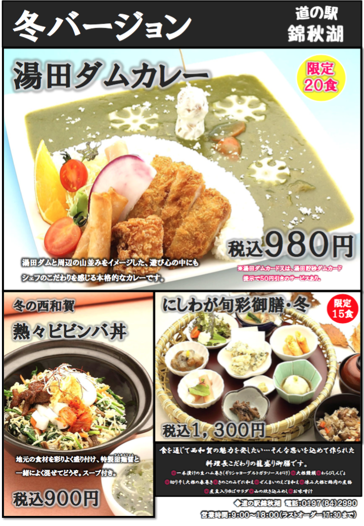Home › お知らせ › 冬のレストランメニューのご案内(12/1〜) 2018-11-30 冬のレストランメニューのご案内(12/1〜) 道の駅錦秋湖で、12/1(土)よりご提供します冬のレストランメニューをご案内させて頂きます。 タグ: 冬のレストランメニュー, 道の駅錦秋湖 関連記事 国道107号災害通行止めに伴う秋田自動車道(北上西IC~湯田IC)の代替路(無料)措置の実施について ユキノチカラビール3種類の販売開始について 【道の駅錦秋湖】レストラン営業時間変更のお知らせ ※訂正 納豆汁のテイクアウト開始しました ちょっとお得な西わらびキャンペーン 秋のレストランメニューのご案内 年末年始の営業について コメントを残す コメントをキャンセルメールアドレスが公開されることはありません。 ※ が付いている欄は必須項目ですコメント ※ 名前 ※ メール ※ サイト 次回のコメントで使用するためブラウザーに自分の名前、メールアドレス、サイトを保存する。 上に表示された文字を入力してください。 Δ