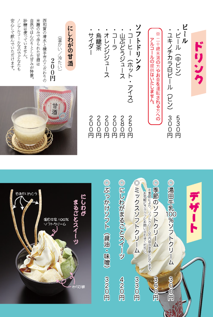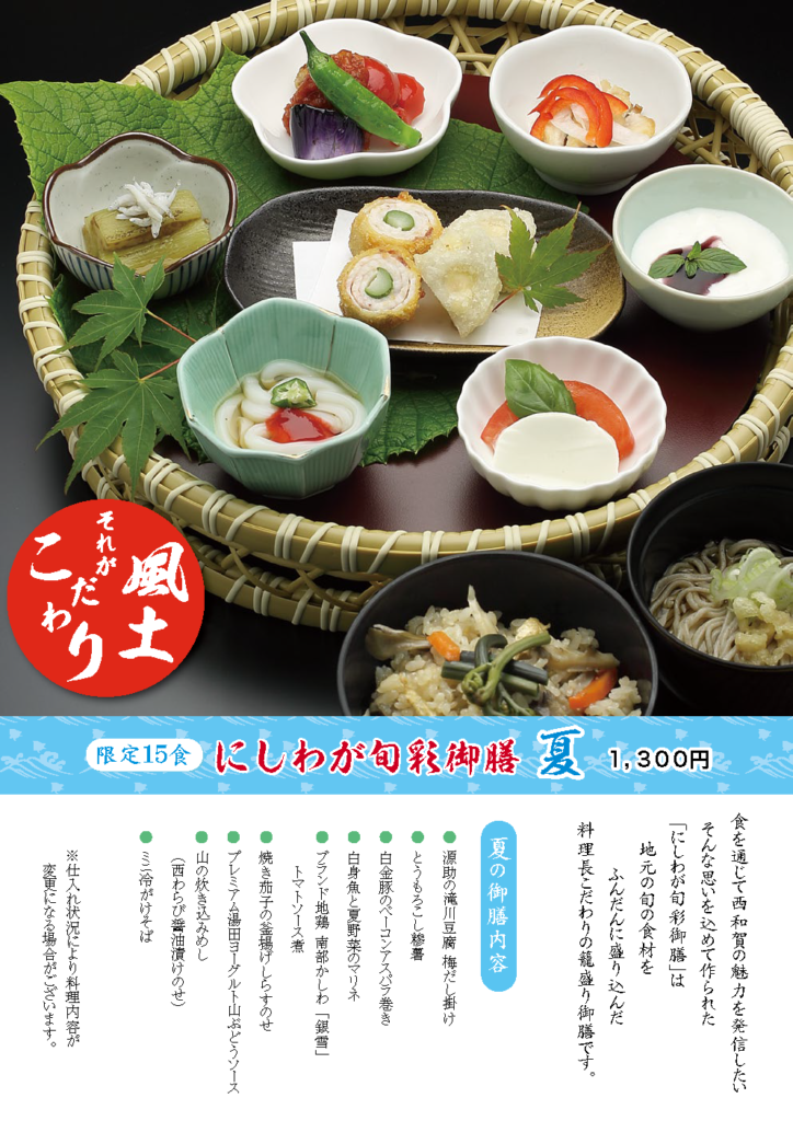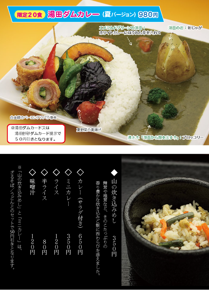 Home › お知らせ › 夏のレストランメニューのご案内(7/20〜) 2019-07-19 夏のレストランメニューのご案内(7/20〜) 道の駅錦秋湖で、7/20(土)よりご提供します夏のレストランメニューをご案内させて頂きます。 タグ: ダムカレー, レストランメニュー, 夏, 道の駅錦秋湖 関連記事 薪ストーブがお客様をお待ちしております 新型コロナウイルス感染拡大防止に伴う漬物バイキングの提供及び山菜水煮販売休止のお知らせ 心と体が元気になる!ちょこっとプレゼントキャンペーン 西和賀の新そば提供を始めました(10/17〜10/25) Go To Eatチケット取扱店舗について 春のレストランメニューのご案内(3/30〜) QRコード決済の対応について コメントを残す コメントをキャンセルメールアドレスが公開されることはありません。 ※ が付いている欄は必須項目ですコメント ※ 名前 ※ メール ※ サイト 次回のコメントで使用するためブラウザーに自分の名前、メールアドレス、サイトを保存する。 上に表示された文字を入力してください。 Δ